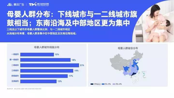 從城市分布來看,在三線及以下城市的母嬰人群占比與一二線城市相近,各占一半左右,且多集中在中部地區(qū)及東南沿海等區(qū)域。