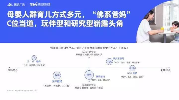 其中佛系占比最高(40%),玩伴(24%)和研究型(19%)也比較多見,保守傳統(tǒng)型的三“好”爸媽反而占比最少(7%),從一個側(cè)面反映出年輕一代育兒觀念、家庭模式的變化。