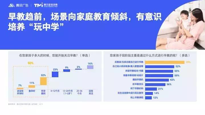 除了基本“保育”,“教育”也是母嬰人群關(guān)注的焦點(diǎn)。洞察顯示,50%的家長在孩子出生前就已經(jīng)在關(guān)注早教知識,不能讓孩子輸在起跑線上成為家長共同的焦慮。同時,在調(diào)查中70%的父母都選擇了在家進(jìn)行早教,早教場景明顯向家庭教育傾斜,父母們有意識培養(yǎng)孩子“玩中學(xué)”。