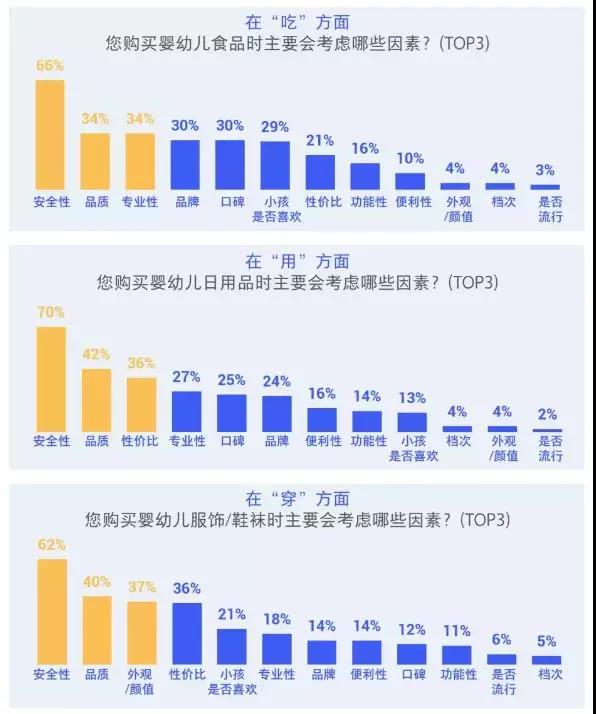 數(shù)據(jù)顯示,消費(fèi)者在選購母嬰產(chǎn)品時的各類考慮因素中,安全性和品質(zhì)最受重視,占比分別超過60%,其中購買嬰幼兒食品注重安全性因素高達(dá)66%,是否流行因素最低僅有3%。