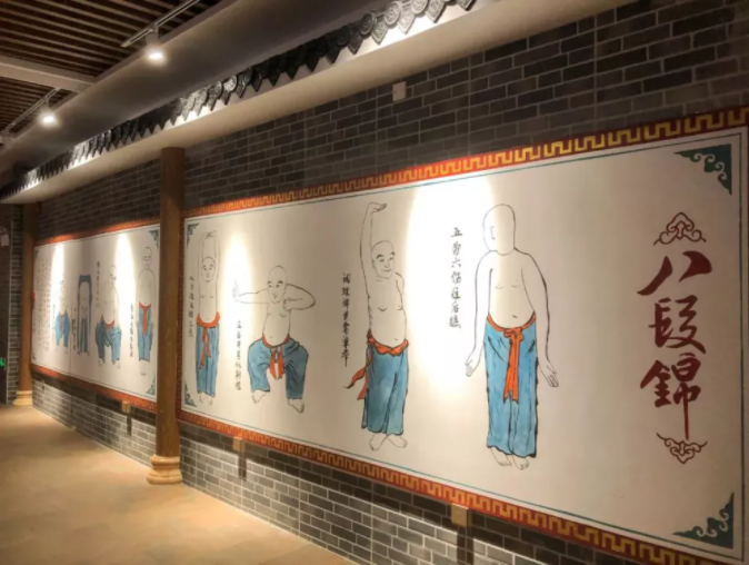 養(yǎng)生健康館的長(zhǎng)廊刻畫(huà)著八段錦的招式,八段錦功法是一套獨(dú)立而完整的健身功法,起源于北宋,至今共八百多年的歷史。整套動(dòng)作柔和連綿,有松有緊,動(dòng)靜相兼;氣機(jī)流暢,骨正筋柔。